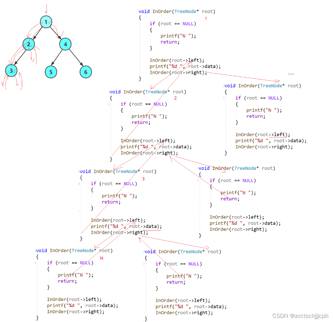 这里遇到根先不是NULL,先走它的左子树,是空就打印返回。
