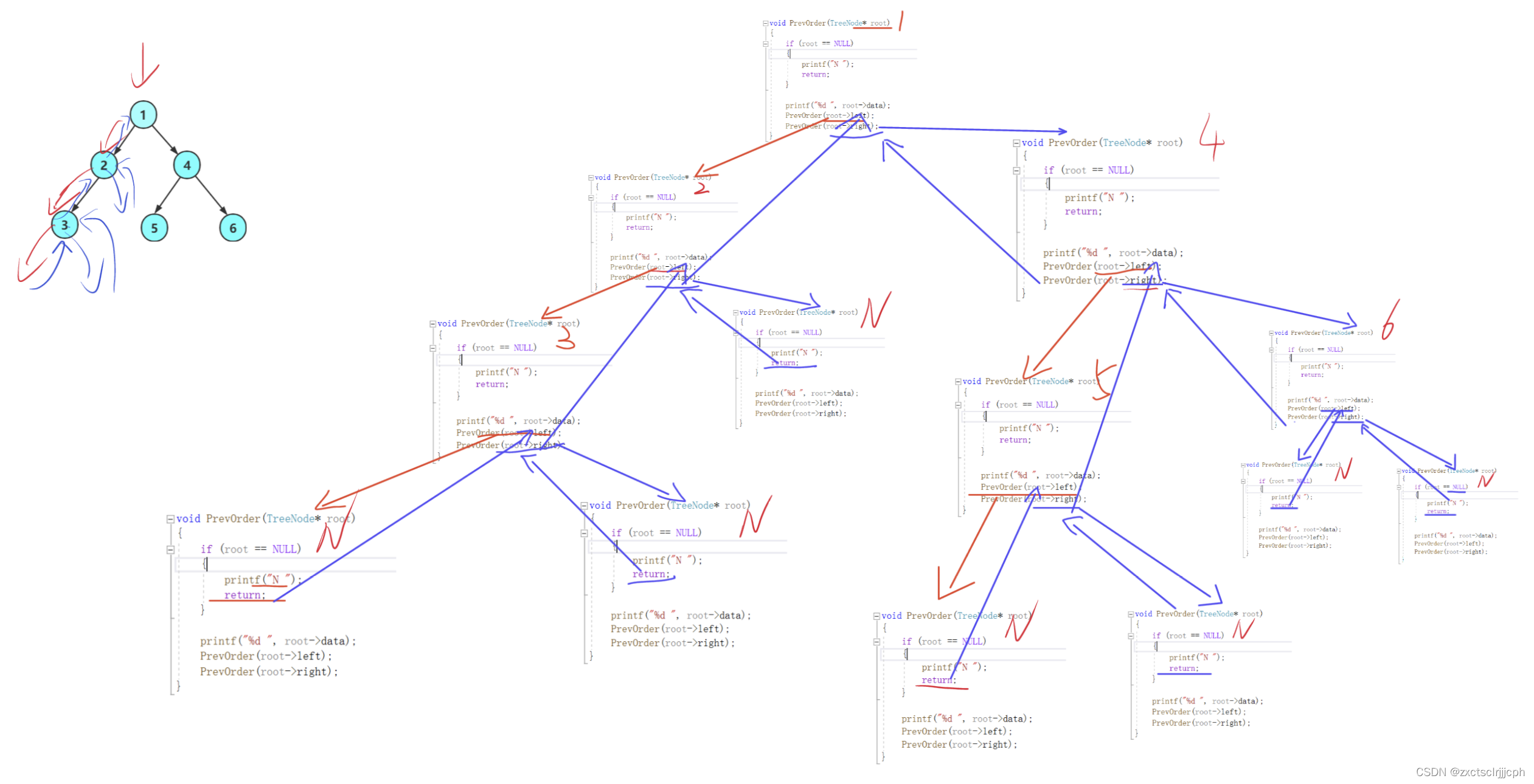 就实现这颗树的前序遍历。 先根,然后左子树,再右子树,初学时把NULL也带上,方便理解。 也就是下面这样。