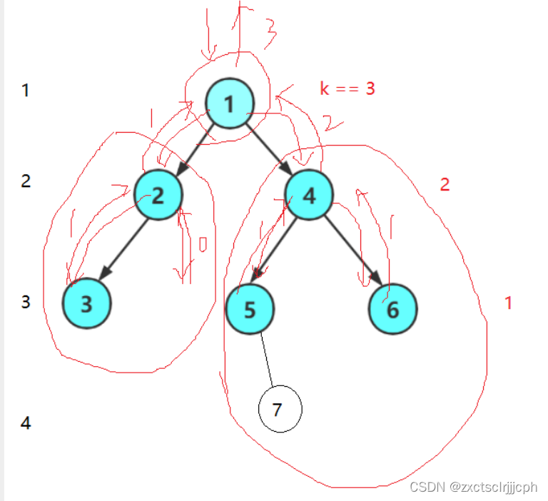 同样以这棵树计算,k>1就说明再第一层的下面。这棵树的第三层的节点数就是,第二层的左加第二层的右;第二层的左又转化成第一层的左加第一层的右,为空就返回0。