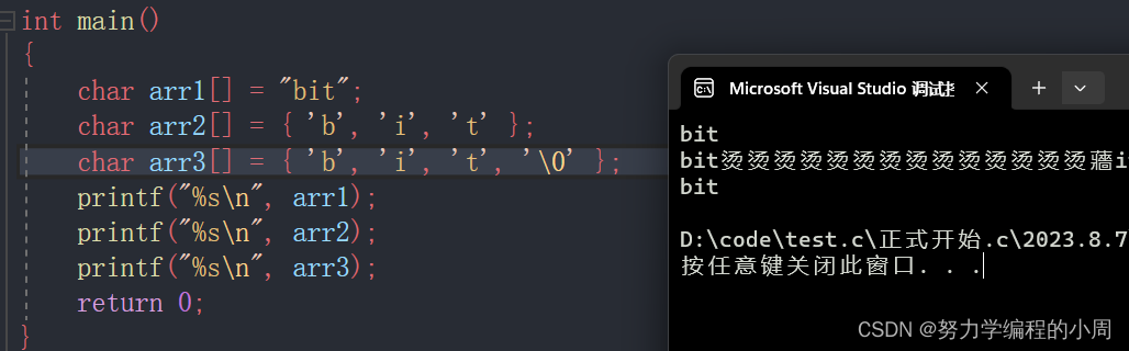 }这是为什么呢?因为arr2没有\0,编译器就找不到,于是就一直找啊找,就崩溃了,因此\0很重要。