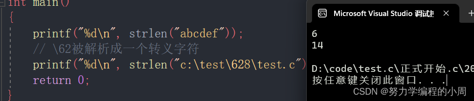 }第一个是因为遇到\0,所以是6个,这个很简单,但是第二个是什么意思呢?其实是这样的,c|:|\t|e|s|t|\62|8|\t|e|s|t|.|c|,大家数一下是不是14个,为什么不是13个呢,因为8已经超出八进制的范围,所以单独算一个。