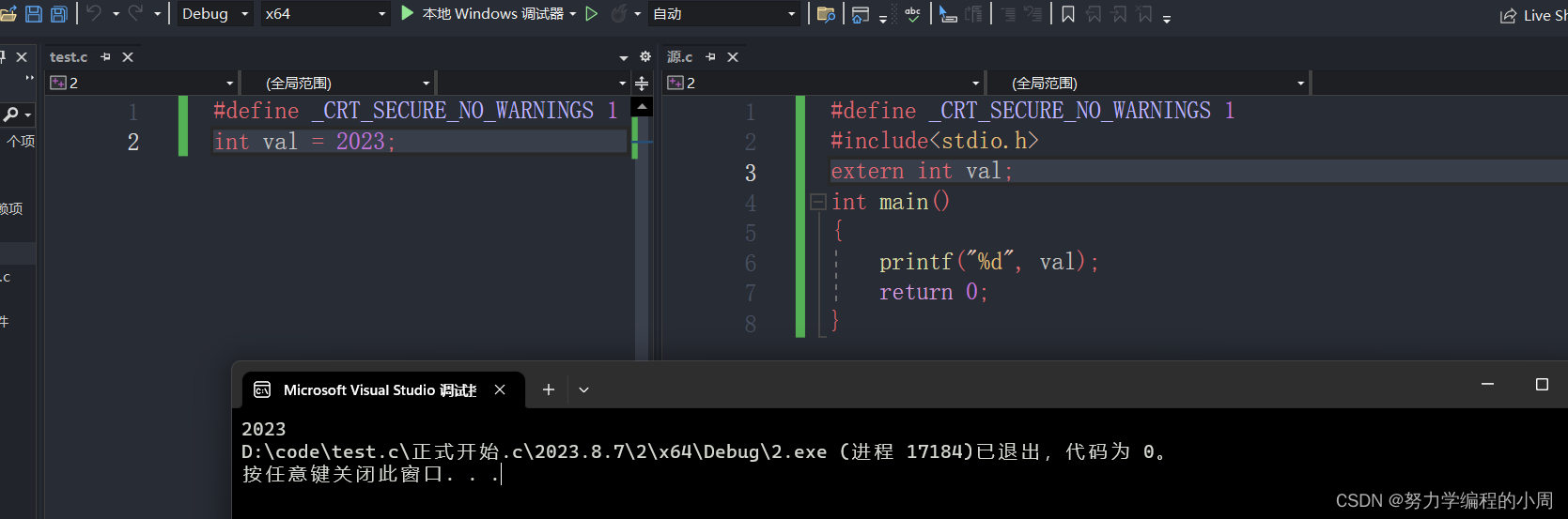 当我们将变量放在另外一个源文件的时候,我们只需要用extern来声明,extern是声明外部符号。