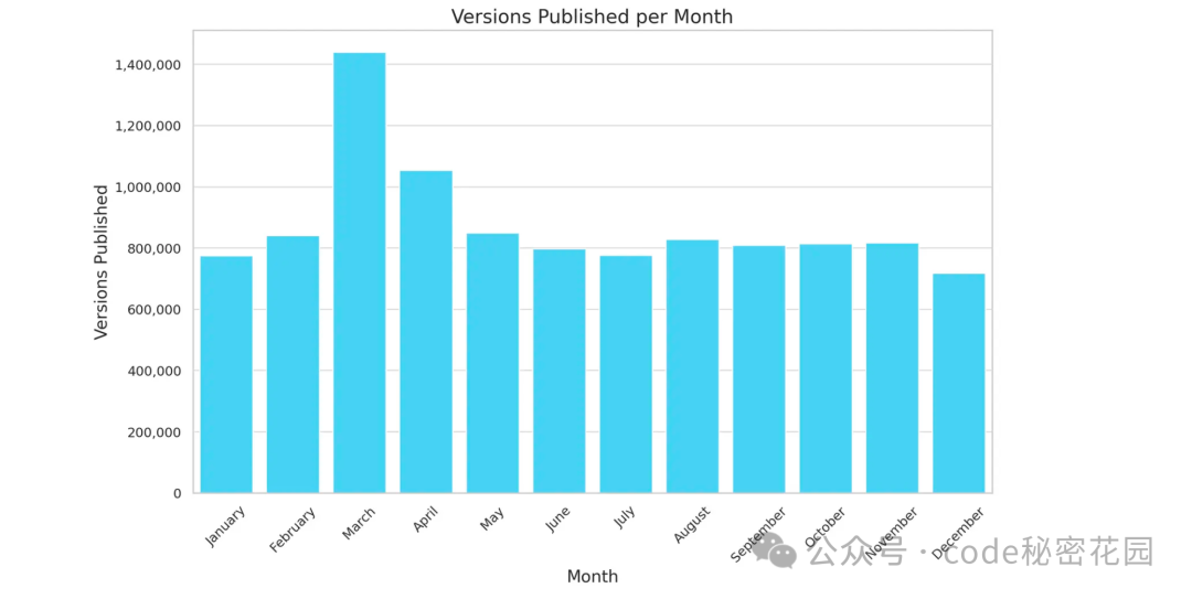 我们的数据显示,在 2023 年,npm注册表上发布了 10,518,566 个软件包版本。以下是按月份分解的数据,显示该注册表在三月和四月份更新的软件包最多,可能是因为在 2023 年三月和四月份,npm 注册表遭受了大规模的以约翰・威克为主题的垃圾邮件和网络钓鱼攻击。