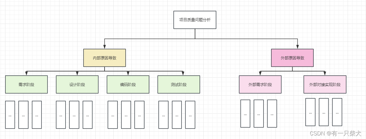 根据内部原因和外部原因,我们继续往下分解,可以细化出各自的原因分类。如内部原因有:需求阶段,设计阶段,编码阶段,测试阶段等。外部原因有:外部需求谈判阶段,外部对接实现阶段等。