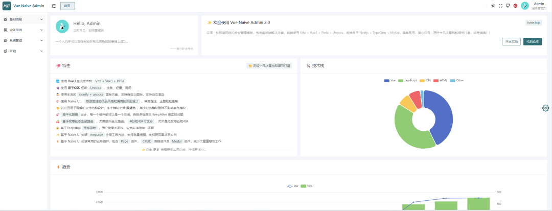 Vue Naive Admin 2.0 是一款极简风格的后台管理模板,包含前后端解决方案,前端使用 Vite + Vue3 + Pinia + Unocss,后端使用 Nestjs + TypeOrm + MySql + Redis。