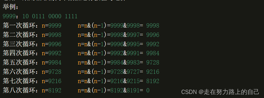 }可以观察下:此种方式,数据的二进制比特位中有几个1,循环就循环几次,而且中间采用了位运算,处理起来比较高效