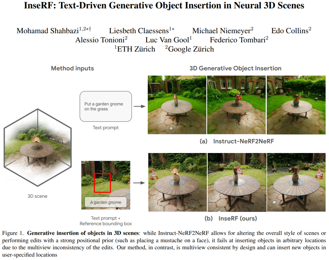 上述研究来自苏黎世联邦理工学院和谷歌,在论文《InseRF: Text-Driven Generative Object Insertion in Neural 3D Scenes》中,他们提出了一种名为 InseRF 的 3D 场景重建方法。InseRF 能基于用户提供的文本描述和参考视点中的 2D 边界框,在 3D 场景中生成新对象。