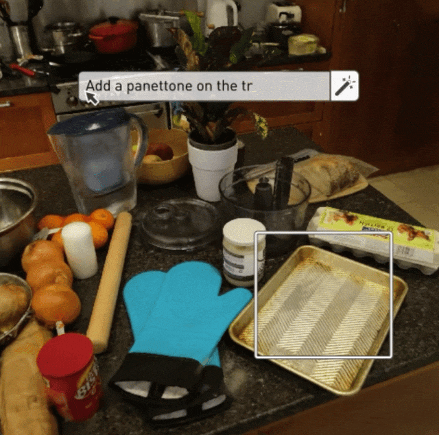 看到下面这张图了没?一开始,盘子里是没有东西的,但当你在托盘上画个框,然后在文本框中输入文本「在托盘上添加意大利面包」,魔法就出现了:一个看起来美味可口的面包就出现在你的眼前。
