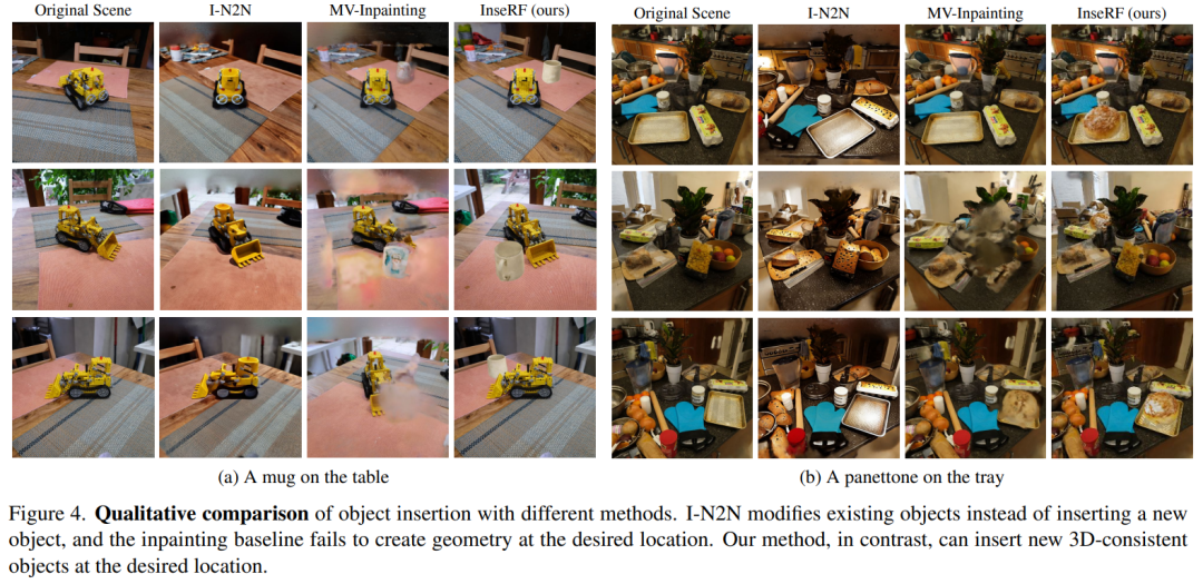 此外,该研究还将 InseRF 与基线方法进行了比较,包括 Instruct-NeRF2NeRF (I-N2N) 、 Multi-View Inpainting (MV-Inpainting) 。