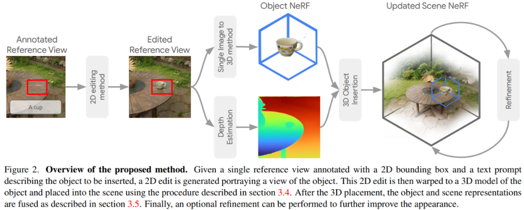 本文将 3D 场景的 NeRF 重建、要插入目标对象的文本描述以及 2D 边界框作为输入。输出结果会返回同一场景的 NeRF 重建,并且还包含在 2D 边界框里生成的目标 3D 对象。