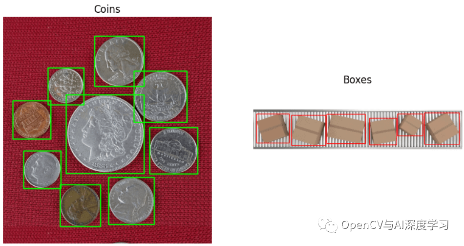 【3】最后通过轮廓分析得到对象的边界框,也就是左上角和右下角坐标。