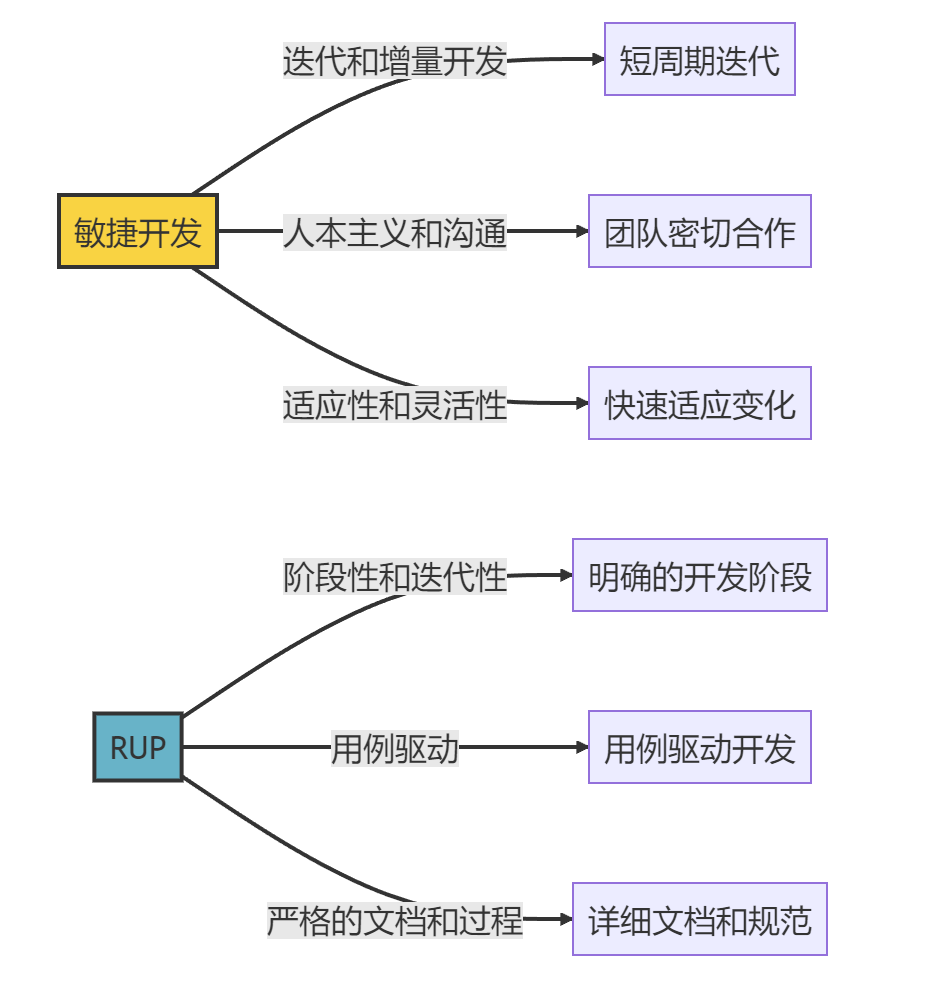 - RUP:强调丰富的文档和UML作为主要建模工具。