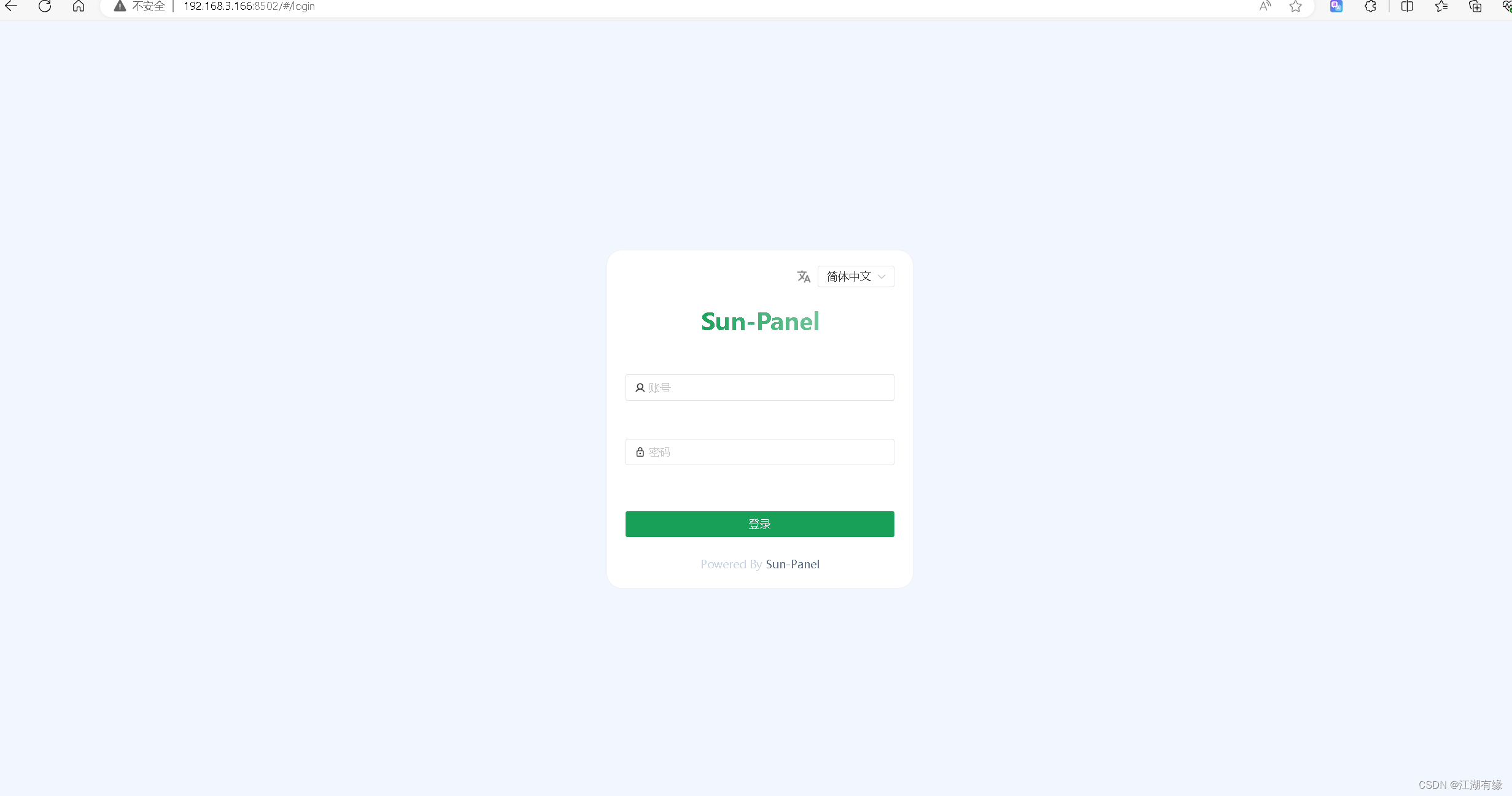 访问地址:http://192.168.3.166:8502,将IP替换为自己服务器IP地址,进入到Sun-Panel登录页。如果无法访问,则检查服务器防火墙是否设置,云服务器的安全组端口是否放行等。
