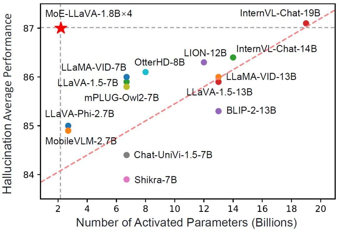 图 1 MoE-LLaVA 在幻觉性能上和其他 LVLM 的比较