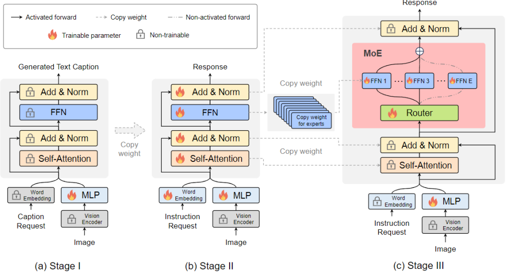 MoE-LLaVA 采用三阶段的训练策略。