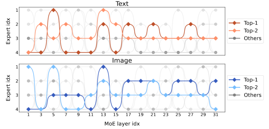 该研究还在 token level 上观察了专家们的行为,并在下游任务上跟踪所有 token 在稀疏网络中的轨迹。对 text 和 image 所有激活的通路,该研究采用 PCA 降维得到主要的 10 条通路,如图 8 所示。研究团队发现对于某个未见的 text token 或 image token,MoE-LLaVA 始终偏向于派发专家 2 和 3 来处理模型深层。专家 1、4 倾向于处理初始化的 token。这些结果能够帮助我们更好地理解稀疏模型在多模态学习上的行为,并探索未知的可能。
