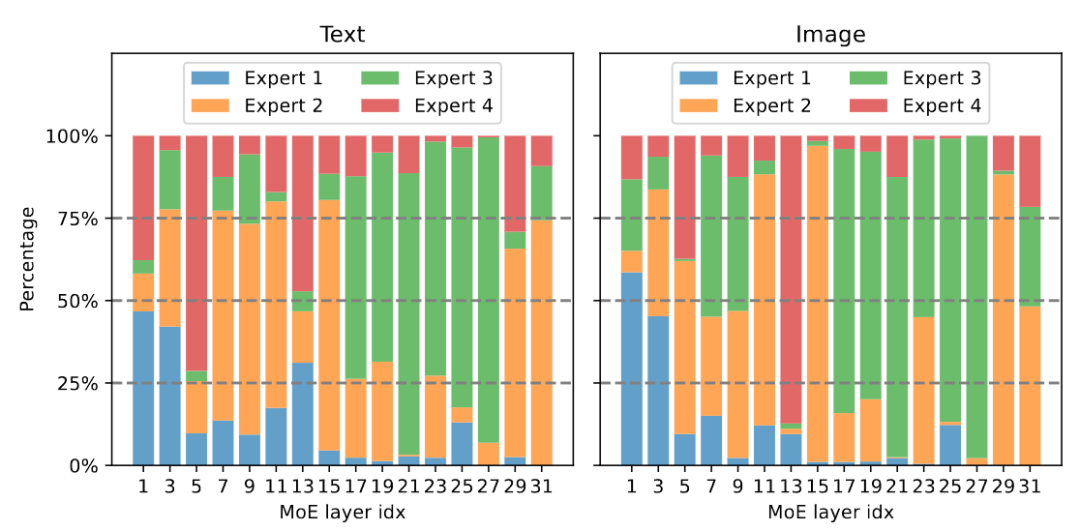 图 7 展示了不同专家的模态分布。该研究发现 text 和 image 的路由分布极其相似,例如当专家 3 在 17-27 层努力工作时,它所处理的 text 和 image 的占比是相似的。这表明 MoE-LLaVA 对于模态并无明显的偏好。