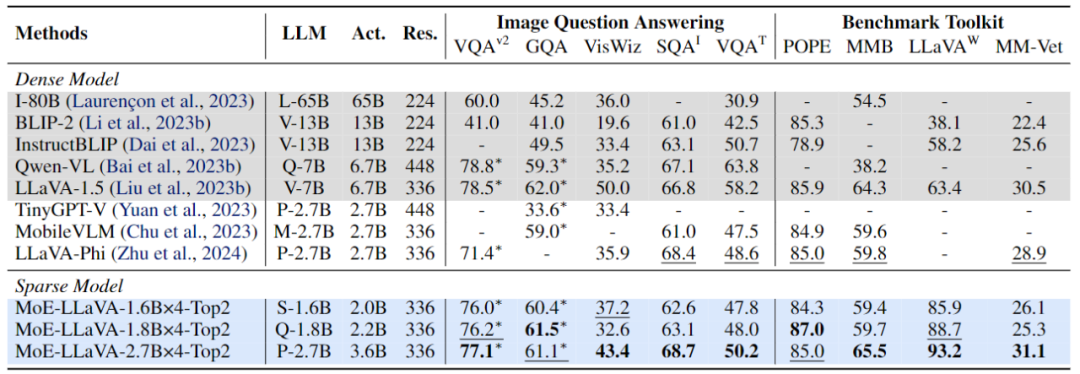 为了更全面地验证 MoE-LLaVA 的多模态理解能力,该研究在 4 个 benchmark toolkit 上评估了模型性能。benchmark toolkit 是验证模型能否能自然语言问答的工具包,通常答案是开放性的并且无固定模板。如图 4 所示,MoE-LLaVA-1.8B×4 超过了 Qwen-VL,后者使用更大的图片分辨率。这些结果都展示了 MoE-LLaVA 这一稀疏模型可以用更少的激活参数达到和稠密模型相当甚至超过的性能。