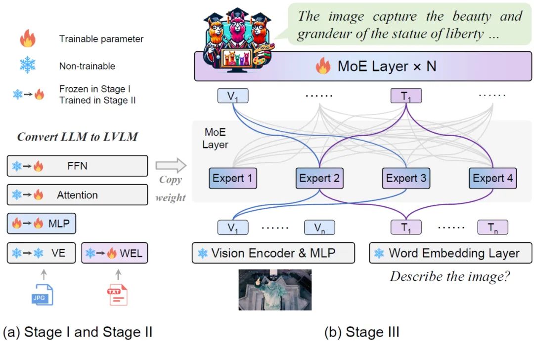 阶段 1:如图 2 所示,阶段 1 的目标是让视觉 token 适应到 LLM,赋予 LLM 看懂图片的实体有哪些的能力。MoE-LLaVA 采用一个 MLP 来将图片 token 投影到 LLM 的输入域,这意味着一个个图片小 patch 被 LLM 当作伪文本 token。在这个阶段,LLM 被训练学会描述图片,理解更高层次的图片语义。在这个阶段 MoE 层不会被应用到 LVLM 中。