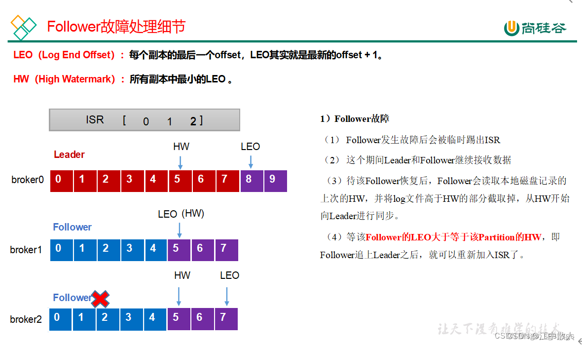Leader维护了一个动态的in-sync replica set(ISR),意为和Leader保持同步的Follow + Leader集合(leader:0,ISR:0,1,2),如果Follower长时间未向Leader发送通信请求或同步数据,则该Follow将被踢出ISR。改时间阈值由replica.lag.time.max.ms参数设定,默认30s,例如如果2超时,(leader:0,ISR:0,1)。