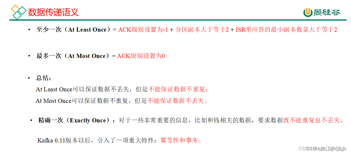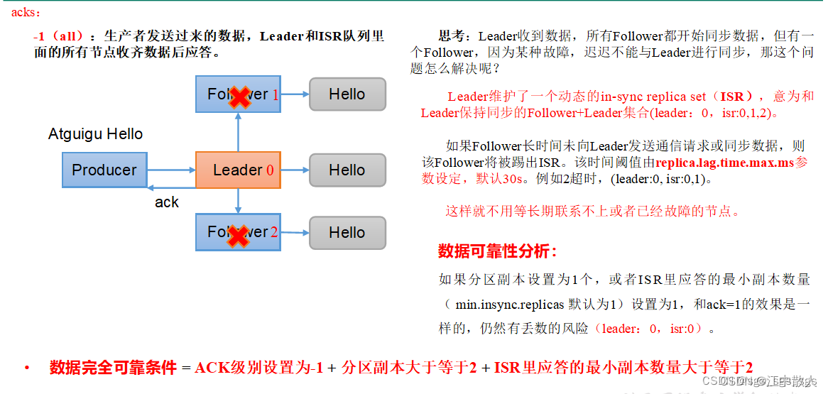 }数据可靠性基于ack应答机制。数据完全可靠的条件:Acks级别设置为-1,分区副本大于等于2,ISR应答的最小副本数大于等于2。
