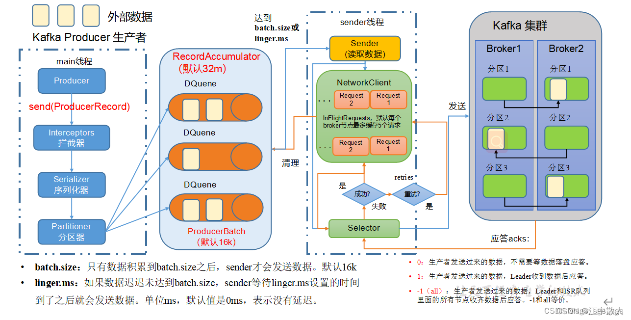 随后经过分区器(分区器实际上是将数据发送到了缓冲队列中,缓冲队列是一个双端队列,其内部包含内存池,避免频繁的申请和释放内存),因为kafka可以对topic进行分区,所以发送时就需要确定向哪个分区发送信息,就由分区器定义的规则来发送,一个分区对应一个队列,这些队列都是在内存中创建的,总大小默认32M,每一批次默认大小32K。