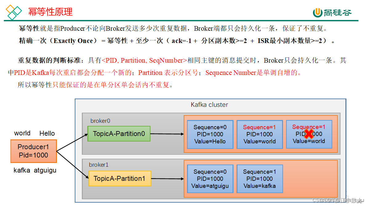 重复数据的评判标准:具有相同主键的信息提交时,Broker只会持久化一条。其中PID是Kafka每次重启都会分配一个新的;Partition表示分区号;Sequence Number是单调自增的。