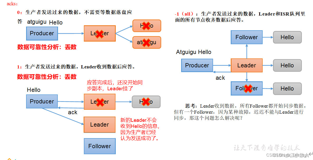 在生产环境中,acks=0很少使用;acks=1,一般用于传输普通日志,允许丢个别数据;acks=-1,一般用于传输和钱相关的数据,对可靠性要求比较高的场景: