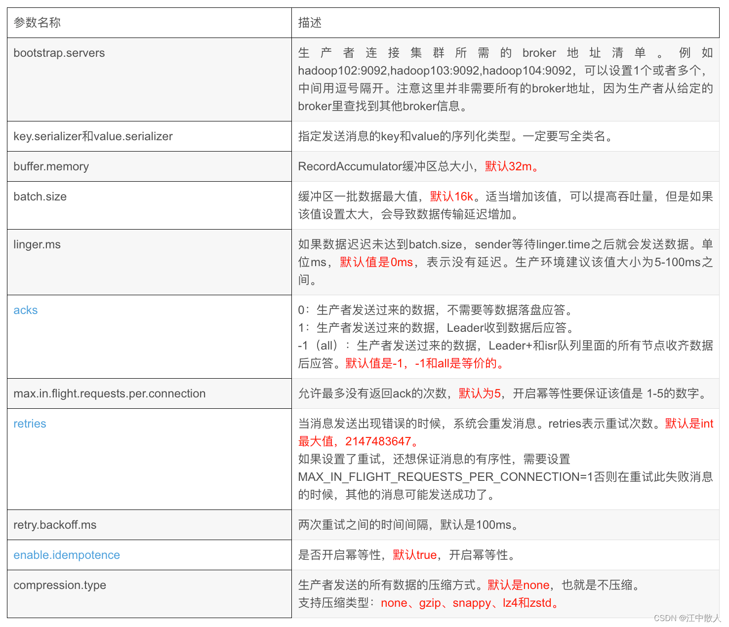 从图中的流程可以看出,生产者和kafka集群之间还有一个RecordAccumulator队列,默认大小是32M,topic分区的话,producer会对应有一个分区器,数据在进入中间队列前,已经被分区器进行了分区,sender()方法在发送数据时,就直接根据分区进行拉取了,拉取时有两个参数,也就是调优参数:
