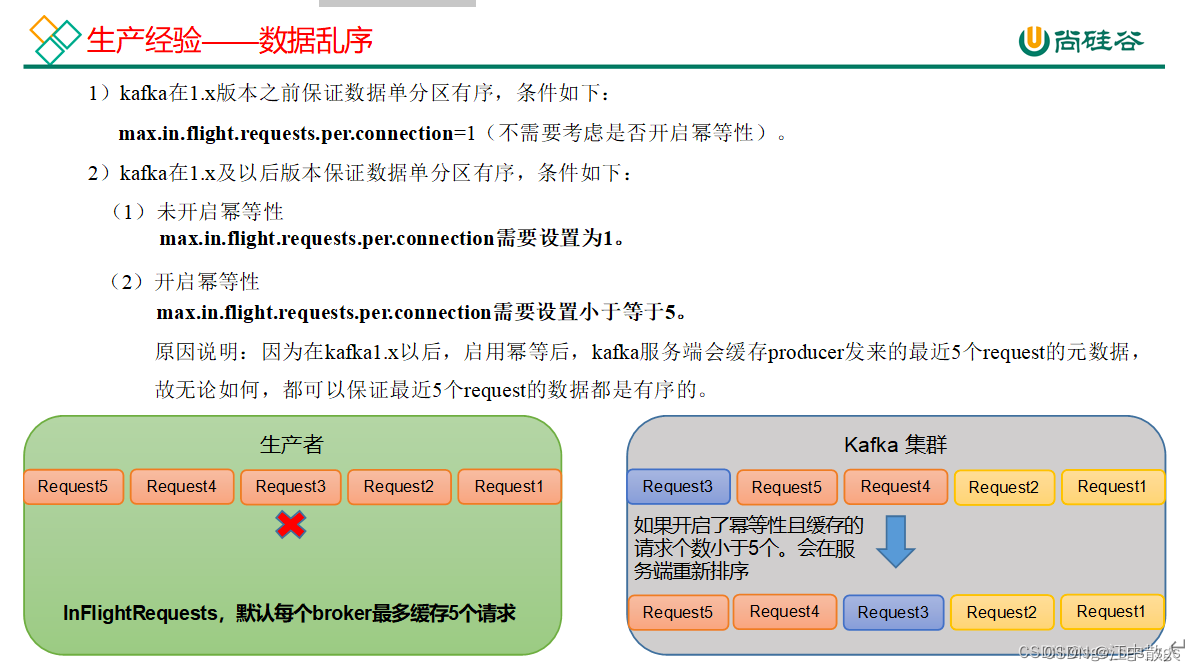 生产端的InFilghtRequests,默认每个broker最多缓存五个请求,当第一个数据发送过去,第二个数据没有发送成功,这时第二波数据就要进行重试,但是此时第三波数据发送,发送成功了,然后第二波数据的重试才发送成功,本来的数据顺序是123,但是现在被改为了132,发生了数据乱序。