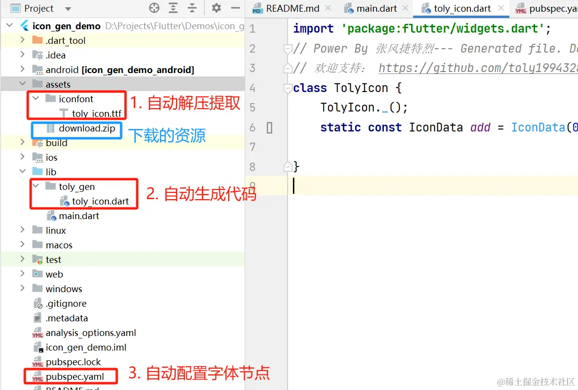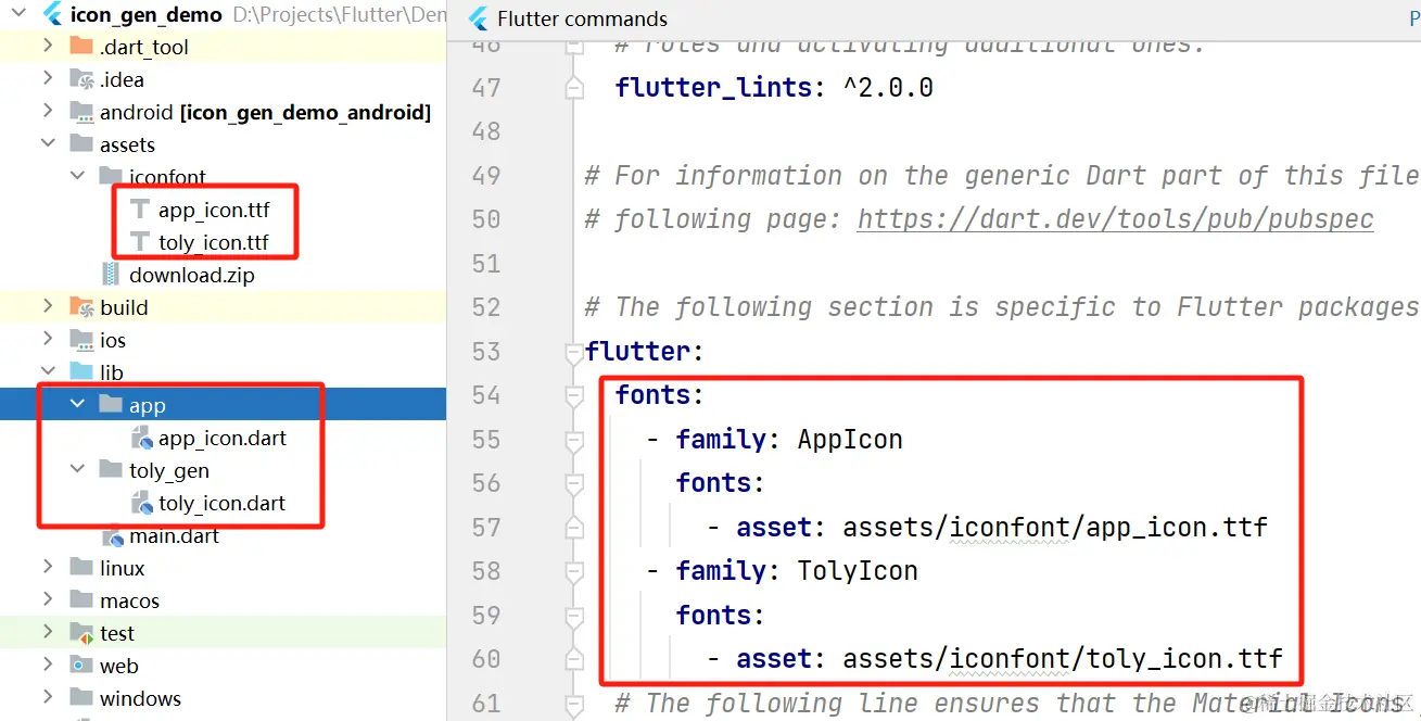 另外, toly icon 支持在 Flutter 项目中通过 pubspec.yaml ,配置一些路径信息。如果不指定,会使用默认值: