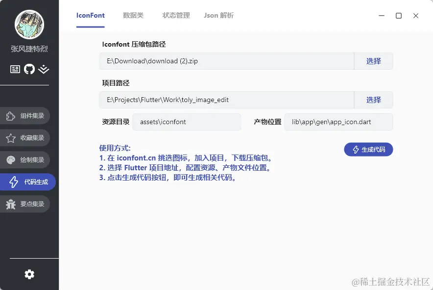 }解析器生成代码的部分在 《FlutterUnit 工具集录 | IconFont 类代码自动生成》 中有详细介绍,这里就不赘述了。
