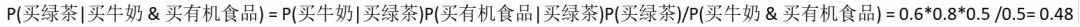 如下举例推测买牛奶和有机食品,再会买绿茶的概率: