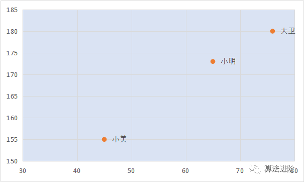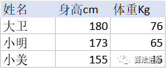 样本数据以如下三个人的身高体重示例: