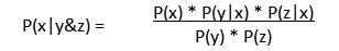 贝叶斯分类算法的理论基础是基于条件概率的公式(应用于现实中P(X|Y&Z)不直观得出,而P(Y|X)*P(Z|X)比较直观得出),并假设已存在的子事件(y,z...实际应用中会有多个)间是相互独立的(因此也称为朴素贝叶斯),当y,z事件假设为独立便有: