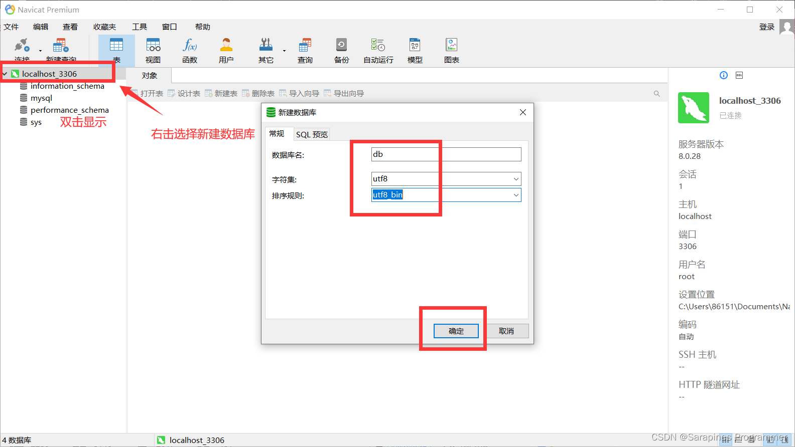 先双击数据库,右击选择新建数据库