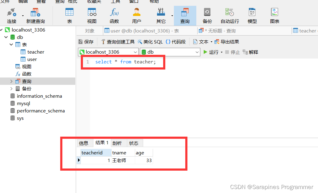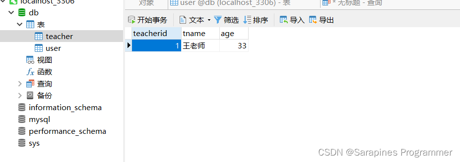 INSERT INTO teacher VALUES(1,'王老师',33);