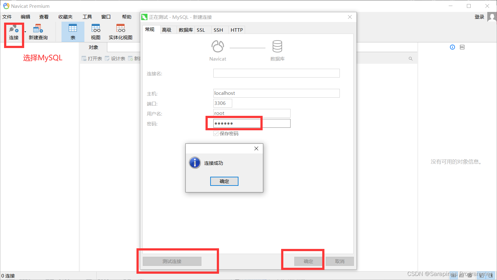 打开Navicat,连接->MySQL->密码123456