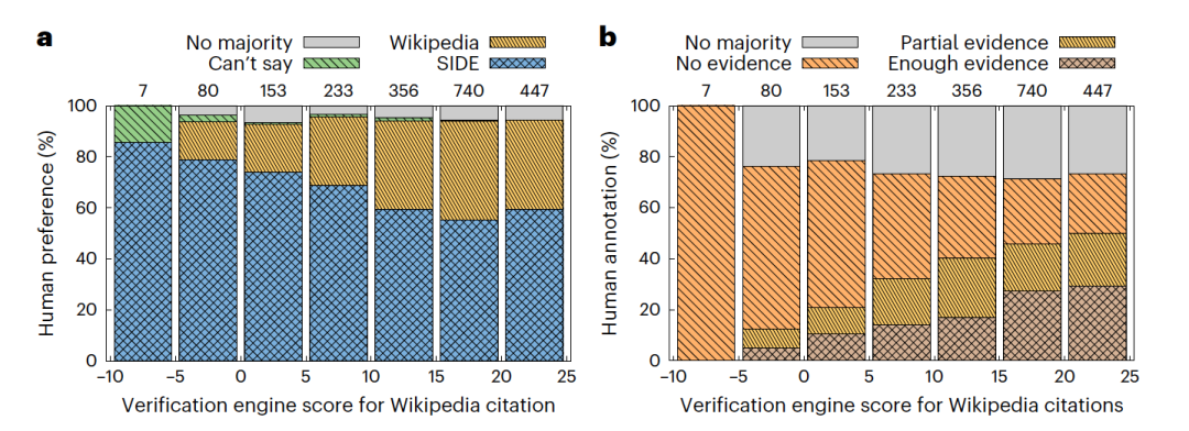 为了测试最终系统的性能,作者进行了两阶段的人类评估:(1)大规模的众包注释活动和(2)小规模的细粒度评估。首先,作者从测试集中选择那些SIDE输出的引用来源得分高于维基百科上的声明。然后,作者要求众包注释者表达他们对哪个引用(SIDE的建议或维基百科的)更好地支持了特定声明的偏好。此外,作者要求他们评估一个来源是否包含足够的证据来支持声明,部分证据(意味着只有声明的部分得到了支持),或者根本没有证据。作者在亚马上进行了注释活动,每次注释支付1.2美元,并为每个声明收集了五个注释。共有192名众包注释者参与了活动。对SIDE建议的来源(图3a)和维基百科证据注释(图3b)的偏好与现有维基百科引用的排名分数成正比——分数越低,对SIDE的偏好越多,维基百科中发现的证据越少。这些结果表明,排名分数可能是引用中证据存在的有效代理,并可能有助于突出需要人类关注的案例。为了验证自动选择每个来源的单个段落所引入的噪声,作者对500多个来源进行了对照研究,询问注释者是否更喜欢选定的段落(即得分最高的)而不是来源内的随机一个。作者发现,在超过80%的情况下,注释者更喜欢选定的段落,其中注释者间的一致性为0.27。最后,为了验证众包注释者的准确性,作者对超过100个未在维基百科引用中找到证据的案例进行了注释。在表1中,作者发现有时证据存在于来源中但不在抓取的文本中;其他时候,它分布在多个段落中(系统无法检测到,但作者计划在未来的工作中解决)。总的来说,超过40%的时间,在参考文献中找不到证据来验证声明。