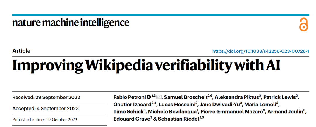 Petroni, F., Broscheit, S., Piktus, A. et al. Improving Wikipedia verifiability with AI. Nat Mach Intell 5, 1142–1148 (2023).