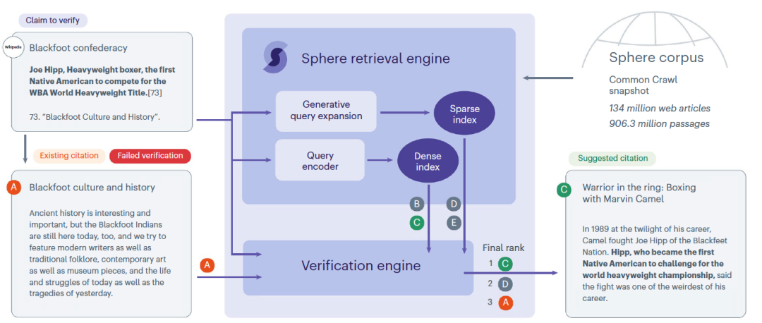 图1提供了SIDE的高层次概览,展示了给定维基百科声明的决策流程示例。接下来,作者简要描述系统的所有主要组成部分及其相互作用。作者使用“声明”一词指的是维基百科引用之前的句子。被引用的文档被表示为一系列段落。当一个声明被人类编辑标记为“验证失败”,或者被作者的验证引擎标记时,SIDE需要检索一系列支持它的文档。人类验证者会通过(1)基于声明的上下文合成搜索查询;以及(2)对搜索引擎执行此查询来做到这一点。从根本上说,SIDE“学会”做同样的事情,使用稀疏和密集检索子系统。声明的上下文是使用引用之前的句子、章节标题以及包含声明的维基百科文章的标题来表示的。作者使用Sphere,一个用于网络规模数据的网络规模语料库和搜索基础设施,作为候选网页的来源。