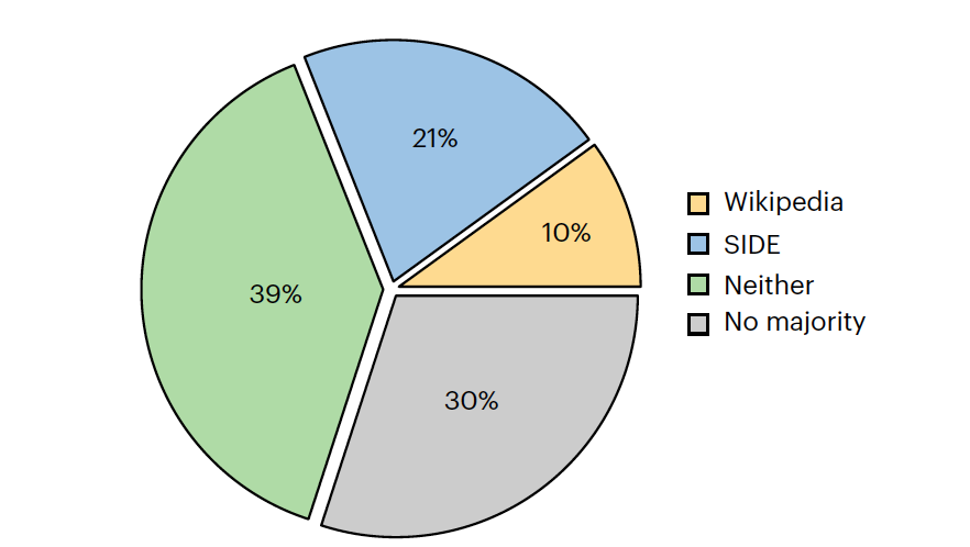 为了在更现实的条件下进行评估并深入了解系统的性能,作者设计了较小规模、细粒度的评估,涉及维基百科社区。这种方法允许与真实的维基百科用户和完整的文档一起,密切评估系统,提供更全面和真实的分析,以找到最适合支持给定声明的来源。为此,作者构建了SIDE的演示,并与英语的维基百科社区接洽,询问用户是否会使用维基百科上的引用、SIDE推荐的排名第一的引用,或两者都不用来验证给定的声明。作者在用户界面中不显示引用的来源(即,维基百科或SIDE),选择在维基百科上可能验证失败的声明-引用对(验证器得分低于0),并允许访问每个引用的全文(而不是单个段落)。结果(图4)显示,SIDE确实可以验证失败的声明-引用对——用户仅在10%的情况下选择维基百科引用,与之相比,60%的情况下选择SIDE的推荐或两者都不选择。没有在30%的声明中找到多数意见的观察结果突显了任务的固有难度。造成这一难度的因素包括用户间不同的解释和偏好、声明的歧义、不同的专业知识以及对引用质量和相关性的熟悉程度不同。值得注意的是,21%的时间里,SIDE提供的排名第一的推荐被维基百科用户认为是合适的。