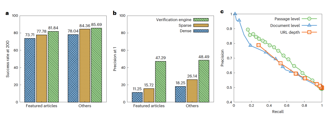 在图2中报告了搜索能力的评估结果。可以注意到,对于从网络检索来说,稀疏检索解决方案的表现优于密集方法,这与之前的观察一致。然而,作者通过结合每种方法的100个结果获得了最佳的指标,因为它们高度互补(见图2a)。值得注意的是,验证引擎组件将原始引用文档几乎50%的时间置于最高排名位置(见图2b)。通常,为特色文章中的声明检索证据比检索维基百科中其他声明的证据更具挑战性,例如,作者观察到特色与非特色文章之间存在大的差异——精确度在密集方法下降了7.0%,稀疏方法下降了10.4%。作者假设是存在与特色内容相关的内在流行偏见。特色内容往往与流行话题相关联,这反过来意味着网络上有更多源包含相关信息。相比之下,更小众文章中的声明在网络上的覆盖度要少得多,因此更容易找到。验证引擎模型显著提高了检索组件的准确性,并几乎消除了特色文章的差距,表明有更强的能力识别证据。这一表现可以通过它利用细粒度语言理解的能力来解释,因为模型可以直接使用交叉关注机制比较两段文本。