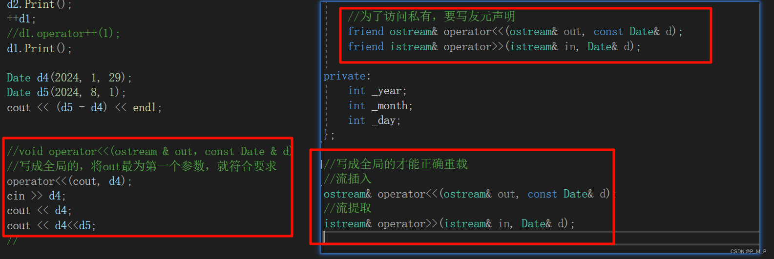 现在尝试去重载operator<<,然后发现没办法将operator<<重载成成员函数。因为cout的 输出流对象和隐含的this指针在抢占第一个参数的位置。this指针默认是第一个参数也就是左操作 数了。但是实际使用中cout需要是第一个形参对象,才能正常使用。所以要将operator<<重载成 全局函数。但又会导致类外没办法访问成员,此时就需要友元来解决。operator>>同理。