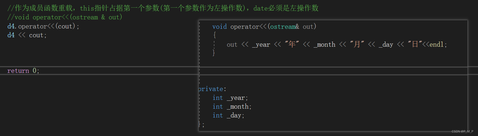 // 因为成员函数第一个参数一定是隐藏的this,所以d1必须放在<<的左侧