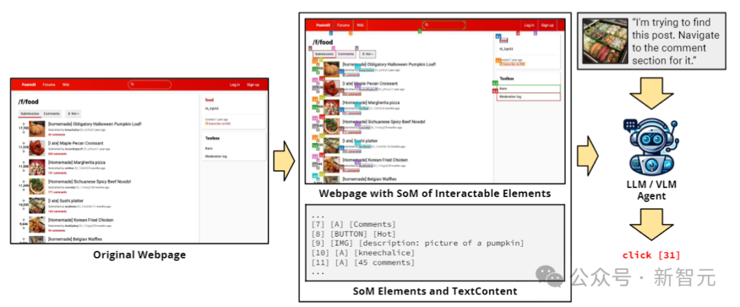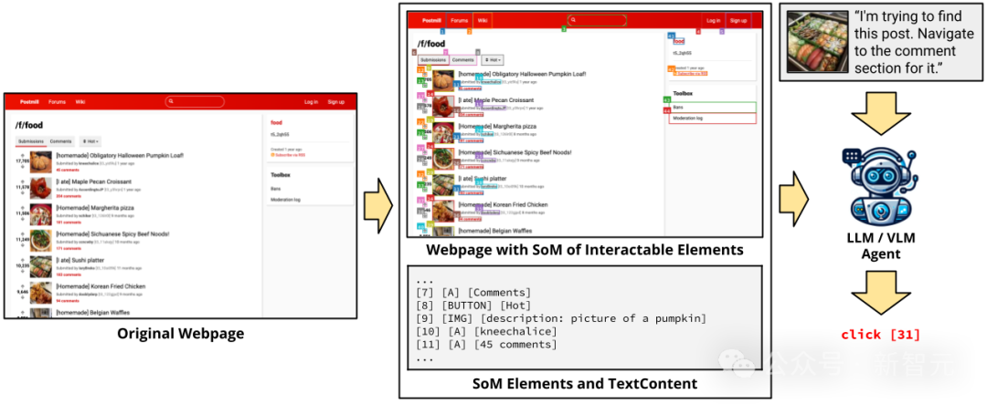 受Set-of-Mark提示的启发,研究人员使用JavaScript自动注释网页上的每个可交互元素来执行初始预处理步骤,包含边界框和唯一ID。