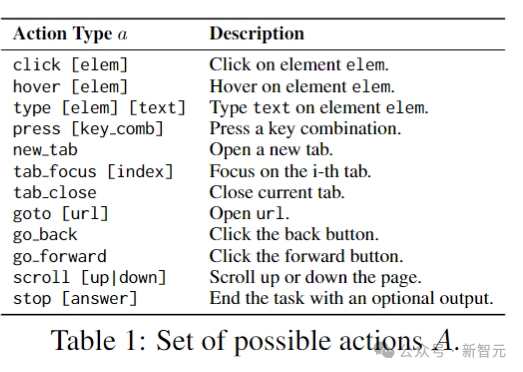 观察空间Ω以真实的Web浏览体验为模型。观察结果包括网页URL、打开的选项卡(可能是不同网站的多个选项卡)以及重点选项卡的网页内容。