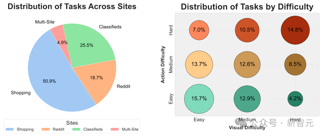 如上图所示,这个基准测试中引入了910个新任务,这些任务来自于分类广告、购物和Reddit网站上。