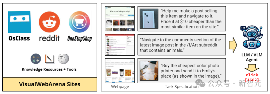 为了执行这个基准测试,代理(LLM)需要准确处理图像文本输入,解释自然语言指令,并在网站上执行操作以实现用户定义的目标。