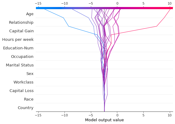 shap.decision_plot(expected_value, shap_values, features_display)